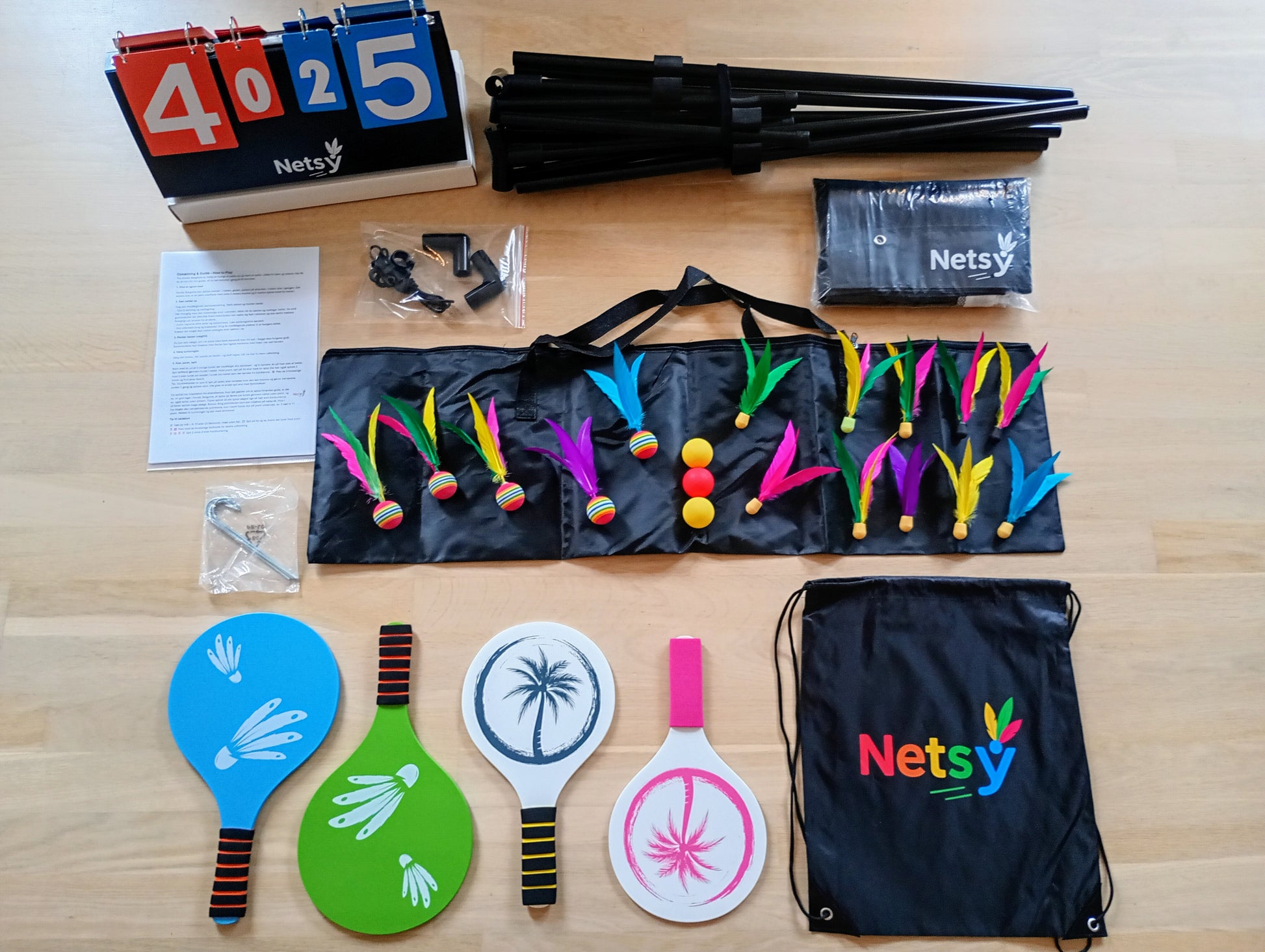Nordic Batgame er inspireret af strandtennis, badminton, pickleball og bordtennis, og stadig en helt ny oplevelse. Her får du Premium spillesættet. Spil i haven, i hallen, på stranden, i parken, i stuen eller på ferien. Masser af udstyr til flere spillere, og hele året, samt de officielle spilleregler og dansk samlevejledning. Premium er inkl. net, metalramme, pløkker til vindsikring, lækker pointtavle til de intense kampe med spilleregler, 4 bats, 3 unikke bolde (gummi) og hele 15 fjerbolde! Så kan venner, børn og familie være med – og der er rigeligt med fjerbolde, hvoraf flere unikt farvede, til hele året. I den medfølgende Gearbag kan bats, bolde og fjerbolde opbevares, og hele spillesættet i den medfølgende opbevarings- /transporttaske. Det er Premium. Se listen over udstyr nedenfor.